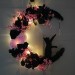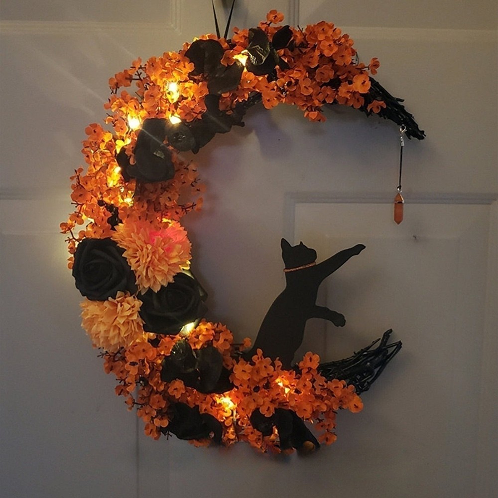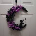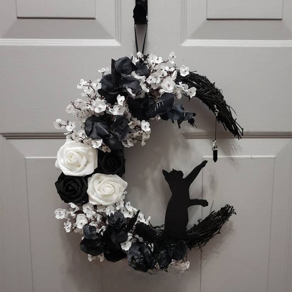 This lovely black and white cat moon wreath will be eye-catching on your door. It has a black cat silhouette pawing at a black crystal. This would be a perfect gift to someone who loves cats, black and white decor, and crystals