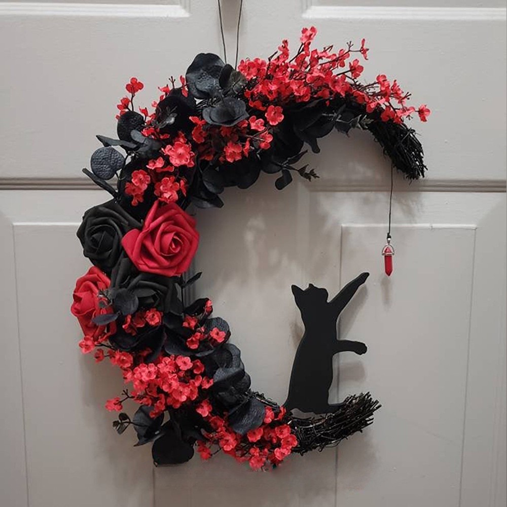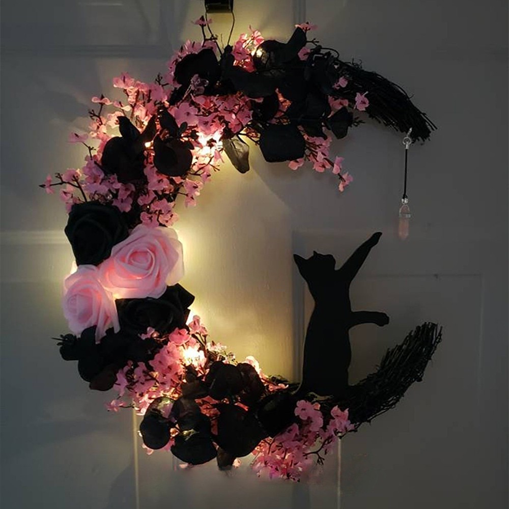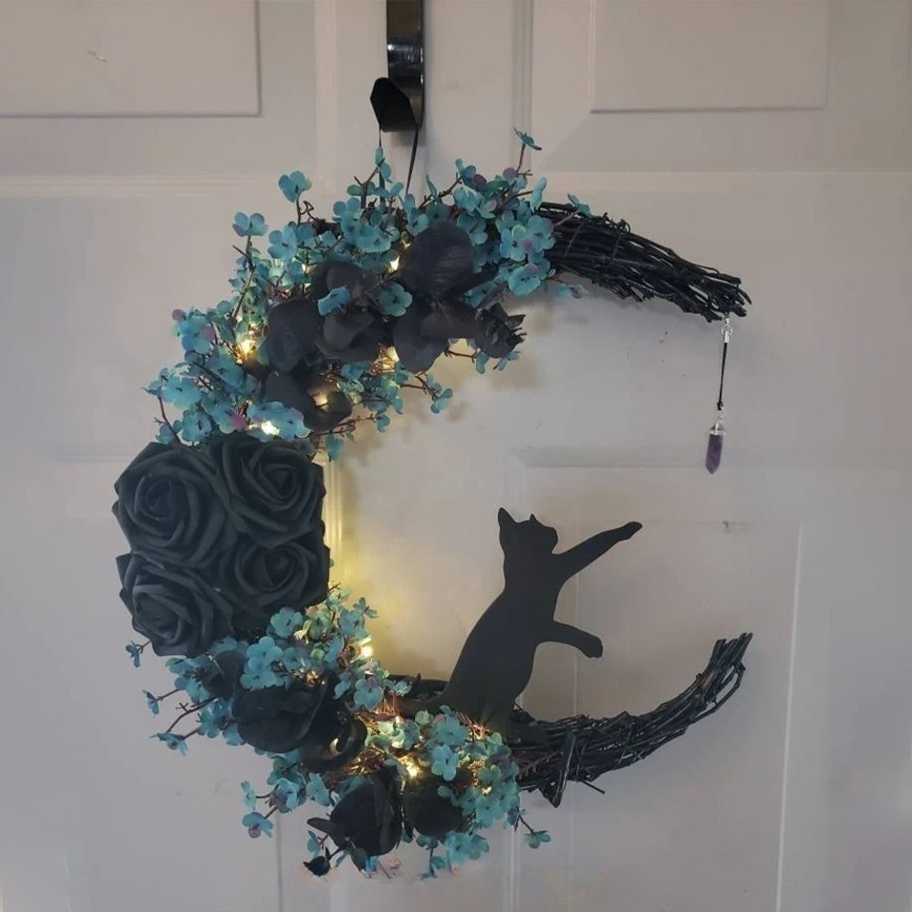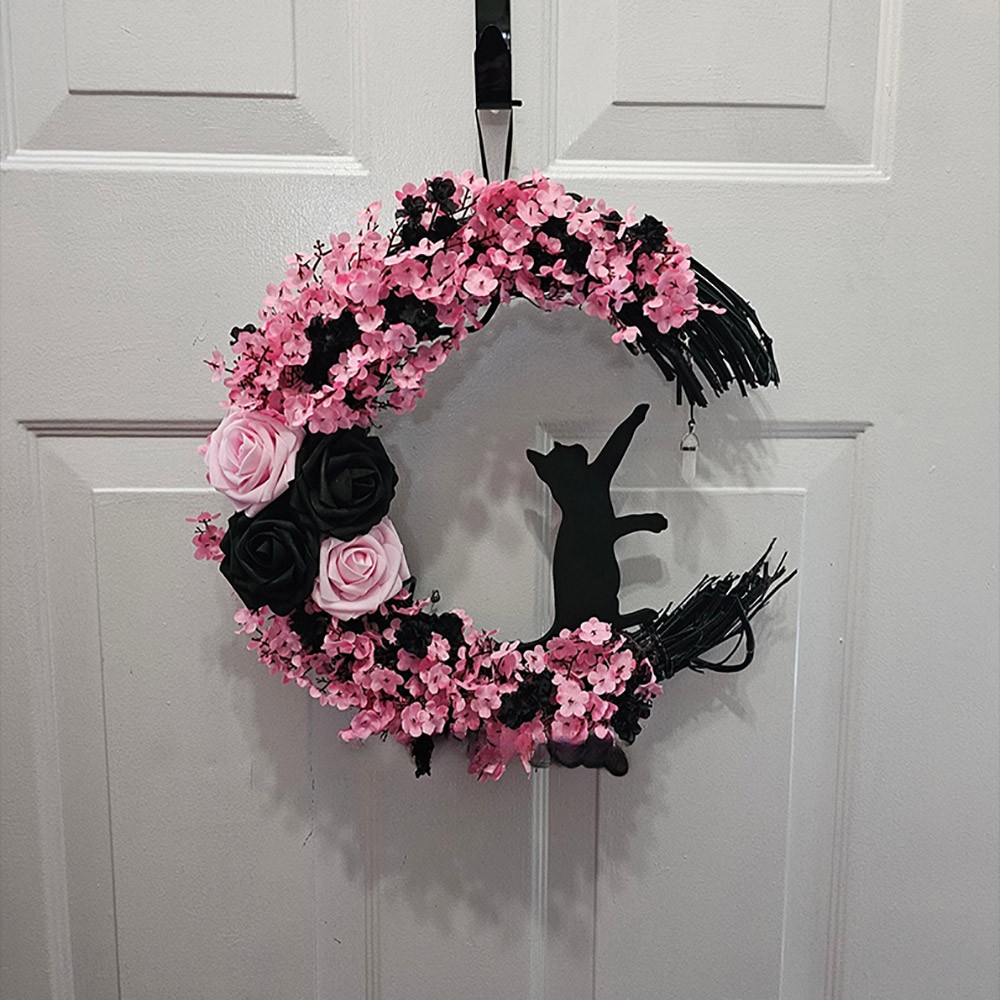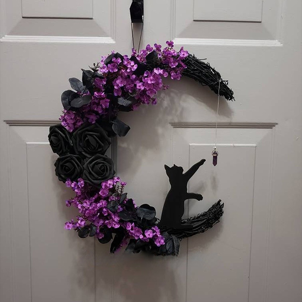 This unique handmade moon wreath is perfect for all year round. Give as a gift to someone who loves Halloween, witchy, and all things gothic. Hang on your door or wall for that pastel goth vibe. Also great for a birthday gift.