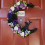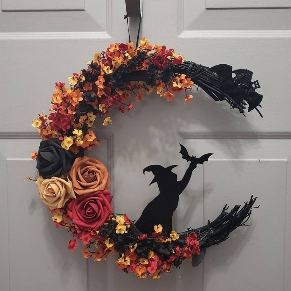 This adorable witchy cat wreath is a must have for Halloween. The bats, black cat, and witch hat is all you need for a spooky home. Give as a gift to anyone who loves Halloween and spooky decor.