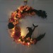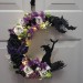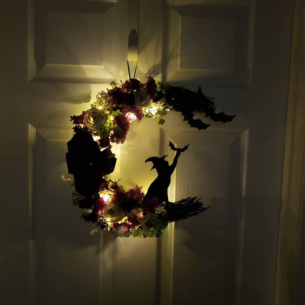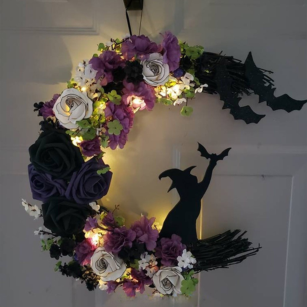Made with a grapevine base painted black. Faux floral. Wood cat. Foam/glitter bats. White fairy lights with flat on/off switch uses watch batteries Hanging ribbon attached.