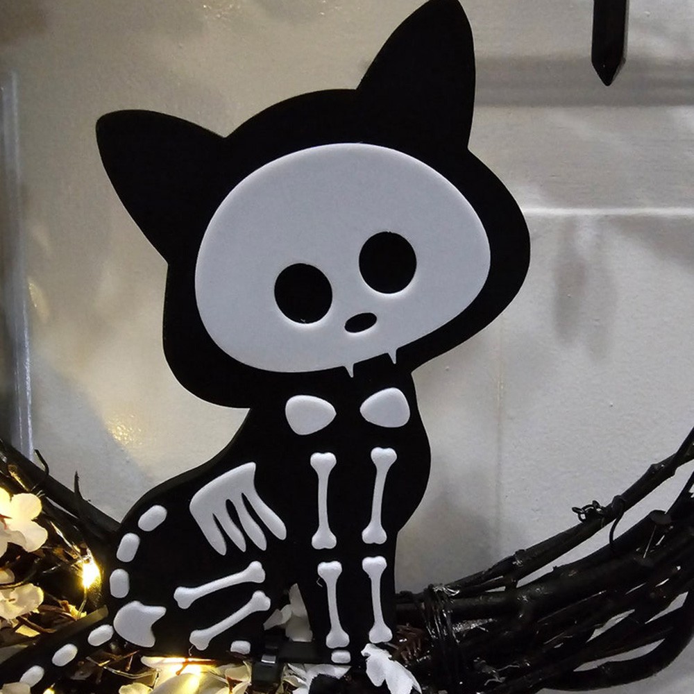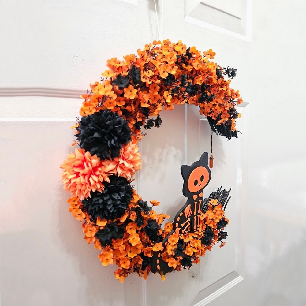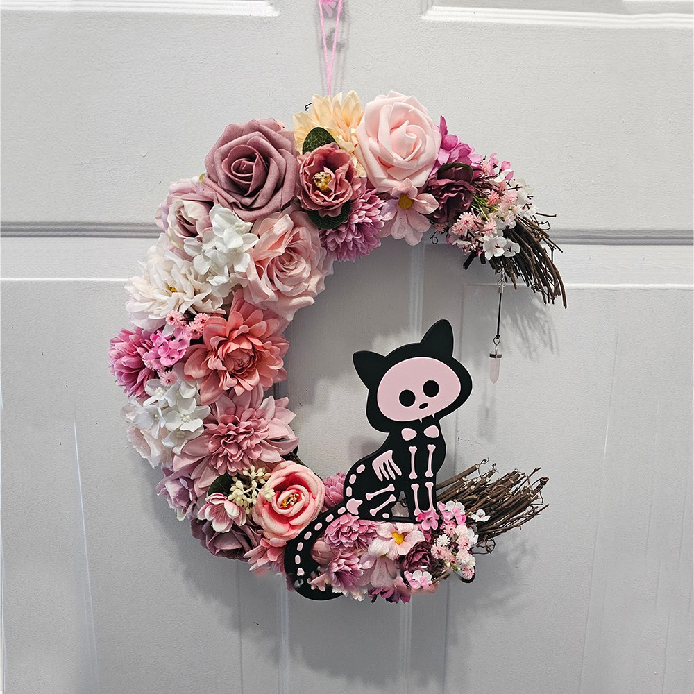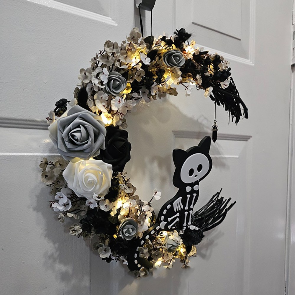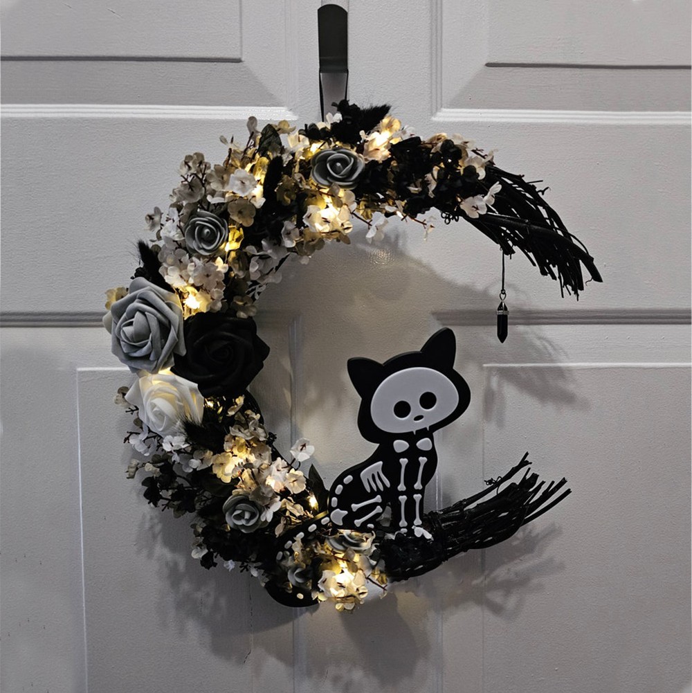 This lovely black, grey, and white cat moon wreath will be eye-catching on your door. It has a skelecat for that added spooky touch. This would be a perfect gift to someone who loves cats, Halloween, and all things gothic.
