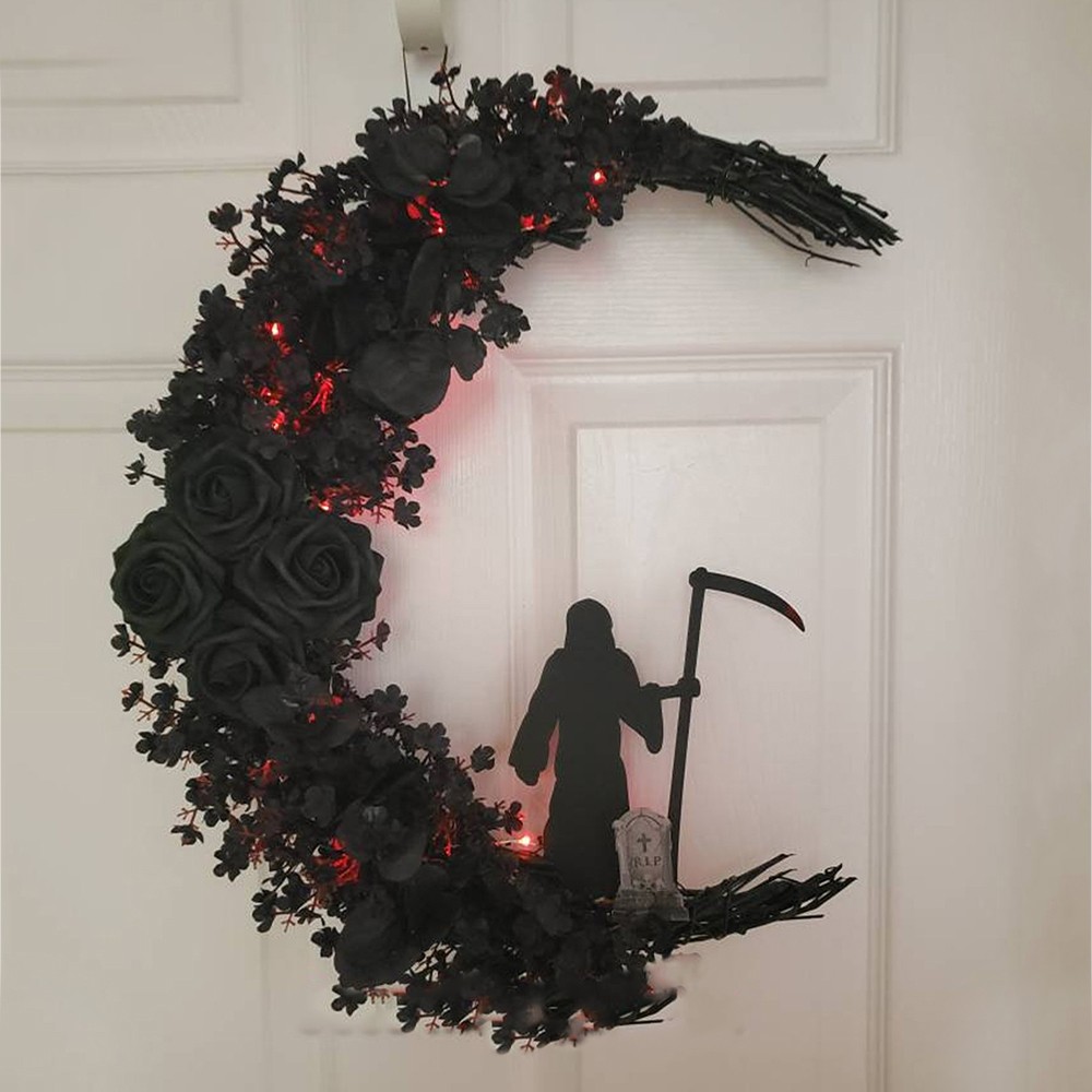 This cool all black moon wreath is a perfect addition to your spooky home decor. The Grim Reaper will welcome your guests for Halloween when you hang this on your front door. It comes with red fairy lights to add that touch of gothic. Give as a gift to any fan of the Grim Reaper.