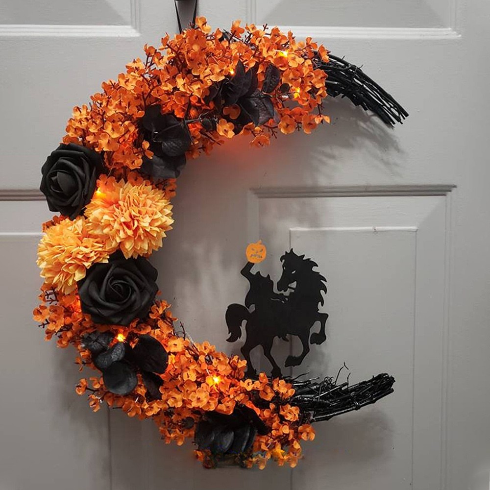 This cool Headless Horseman Wreath is a perfect addition to you spooky home decor. Use as a Halloween decoration or keep up all year round. Give as a gift to anyone who loves Halloween and gothic, spooky decor.
