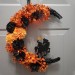 Made with a grapevine base painted black. Faux floral in orange and black. Wood cut out painted. Hanging ribbon attached.