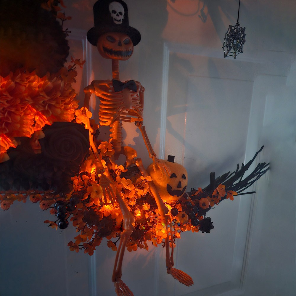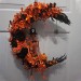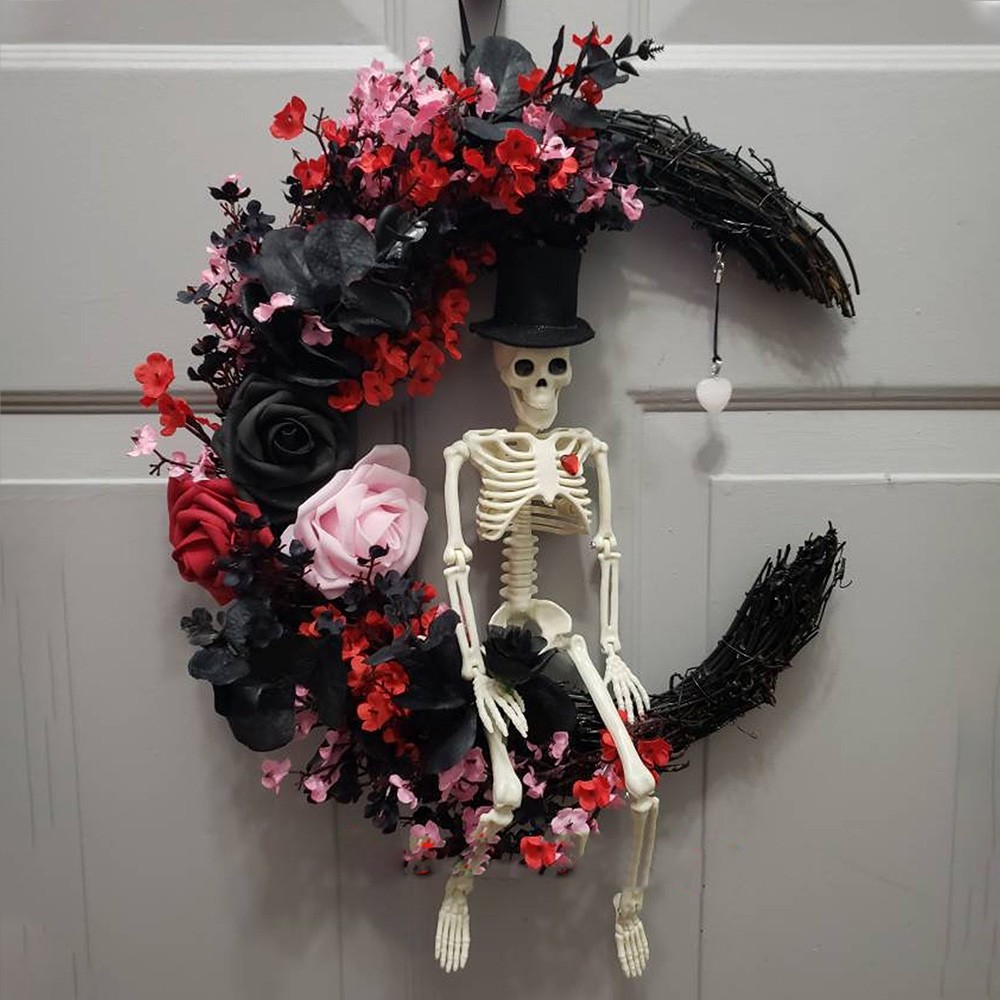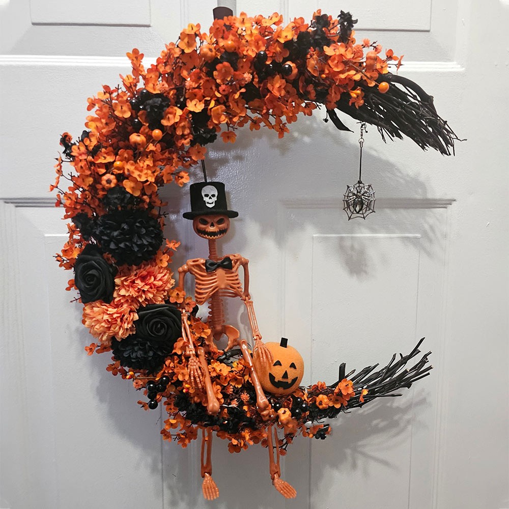 This lovely skeleton pumpkin moon wreath is perfect for your gothic home decor. It's black and orange color is a beautiful touch to your dark interior style. Give as a gift for Halloween wedding, birthday, or anniversary to anyone who loves moons, pumpkins, skulls, and all things gothic.