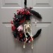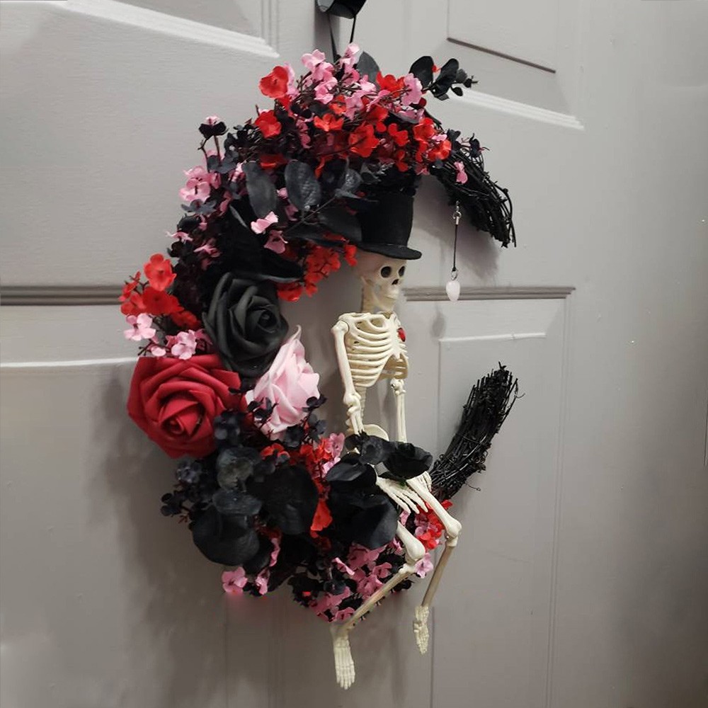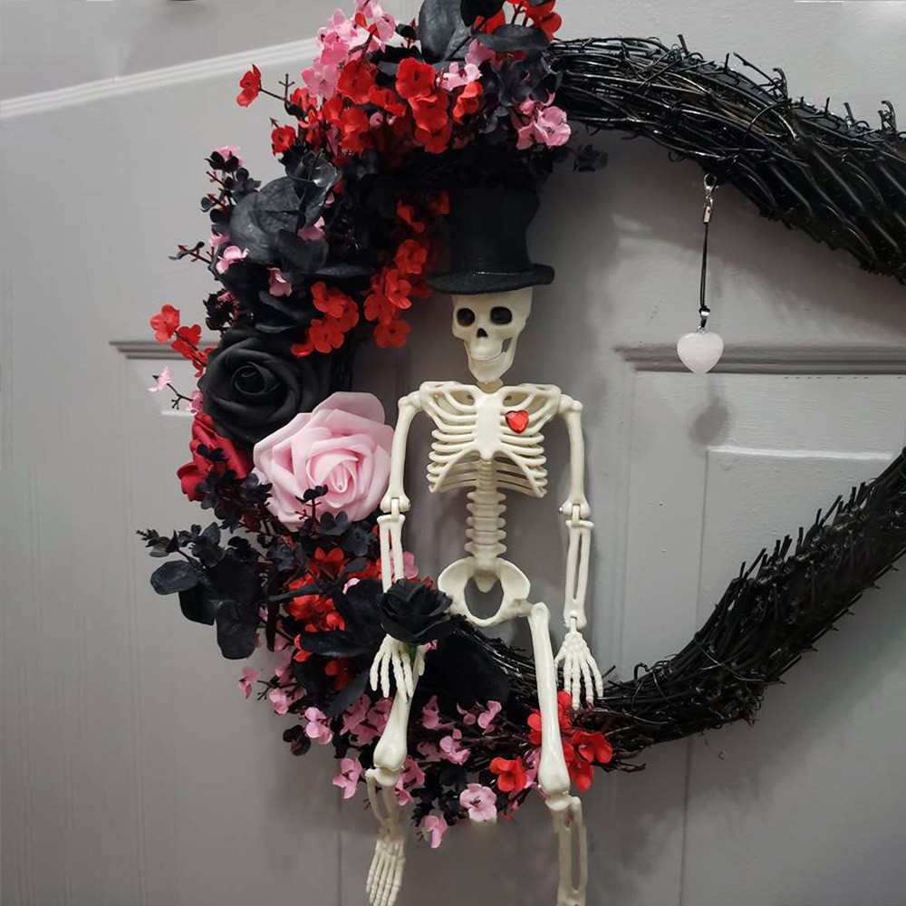 -Made with a grapevine base painted black. Faux floral. Plastic posable skeleton. Pink rose quartz crystal pendant. Hanging ribbon attached.
