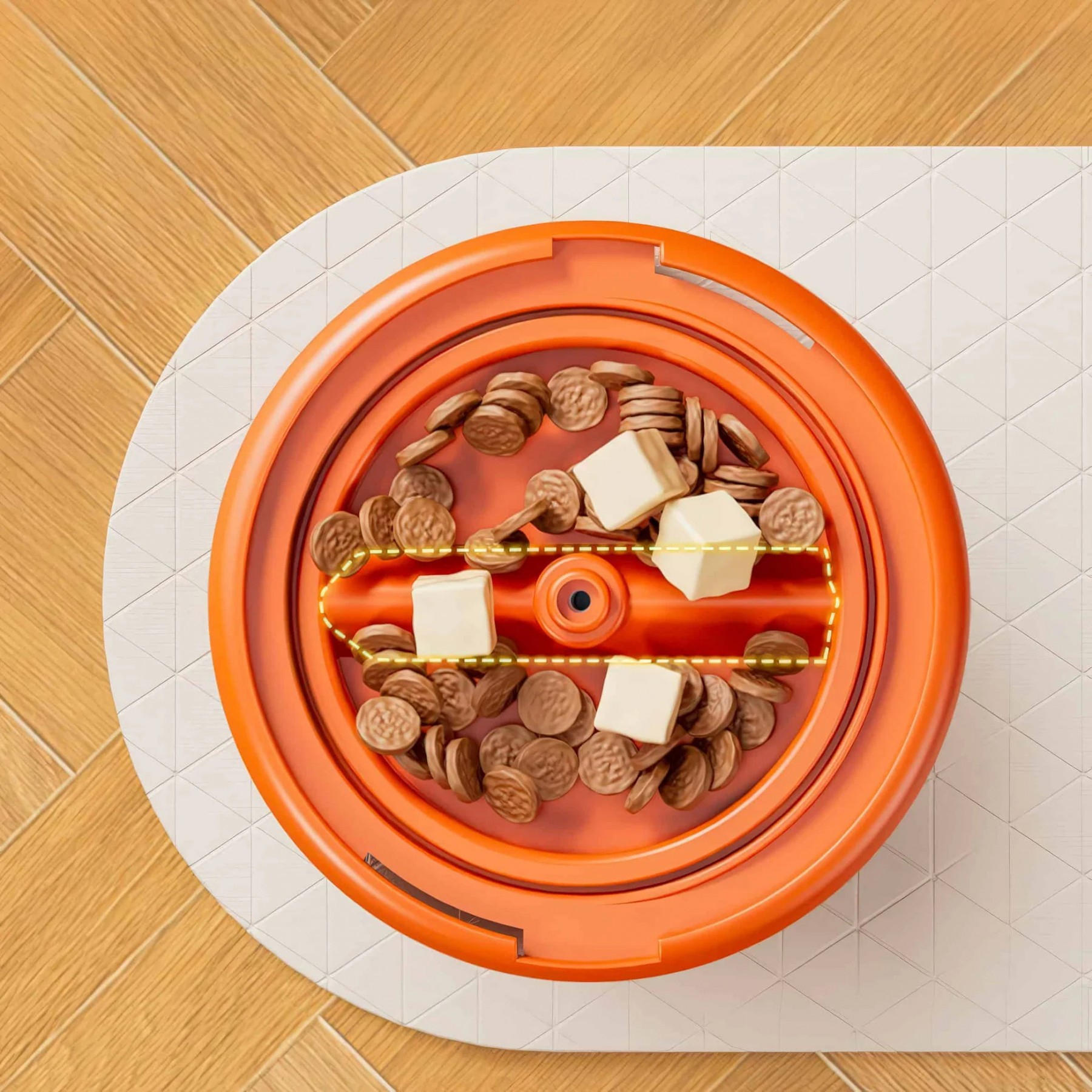 Cute design! Love the clear top—you can see the food spinning inside. Just a light press and out comes the kibble.